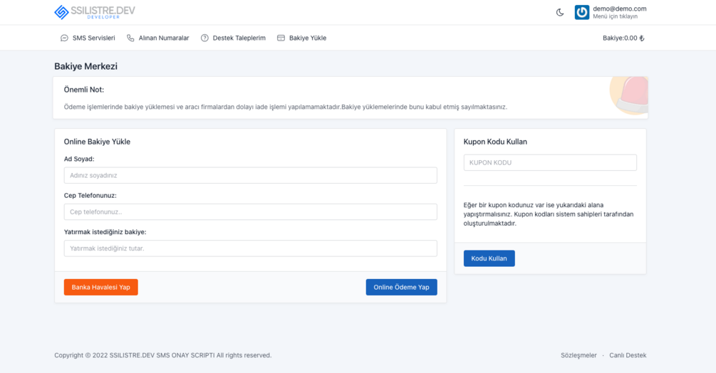 - Kupon Sistemi ile bakiye dağıtabilirsiniz.